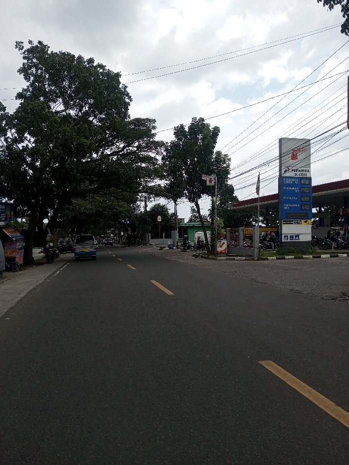 The scene is a roadside view, located in Khajuripada, India, under an overcast sky. A two-lane asphalt road with yellow dashed center markings extends into the distance from the foreground. On the left, a sidewalk parallels the road, featuring a small vendor stall, several parked motorbikes, and large, dense trees. Further down the road on the left, additional buildings are partially visible. A light blue van or minibus travels away from the viewer in the left lane. To the right of the road, a PERTAMINA gas station is prominent. Its tall sign displays "PERTAMINA 34.43209" at the top, followed by prices for fuel types: "PERTAMINA TURBO," "PERTALITE," "PERTAMAX," and "SOLAR." An Indonesian flag is affixed to the pole below the sign. The gas station features a red canopy over fuel pumps, with numerous motorbikes and scooters parked or idling, suggesting activity involving multiple individuals. A "CCTV" sign is visible near the base of the main sign. More trees line the roadside and obscure parts of the background. Overhead, numerous electrical and utility lines crisscross the sky.