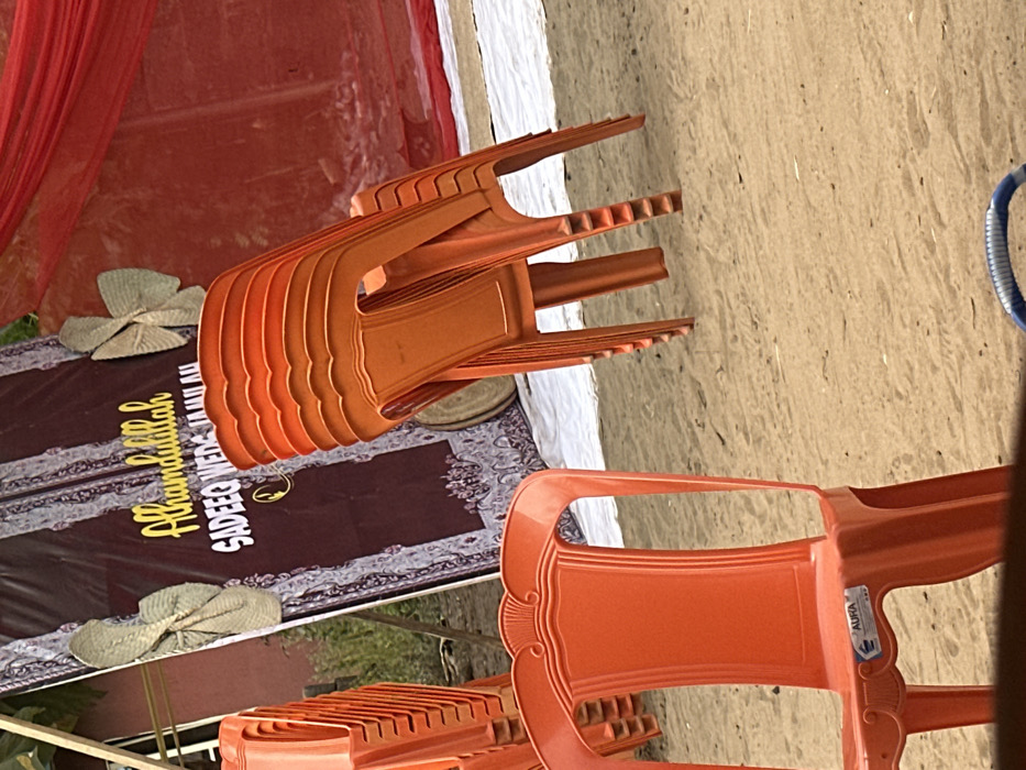 The image depicts an outdoor scene in the city of Idah, Nigeria, characterized by preparations or the aftermath of an event. The ground is composed of light brown sand or dirt. Multiple stacks of identical orange plastic chairs are visible. In the foreground, a single orange plastic chair faces away from the camera, with the word "AURA" visible on its lower back. To the right, another stack of approximately ten orange chairs is angled towards the center. To the left, a partial view of another stack of orange chairs is present. In the background, a large vertical banner or backdrop is erected. It features a dark brown field with intricate light-colored patterns along its borders. Centrally located on the banner is text in a stylized yellow font, reading "Alhamdulillah" at the top and "SADEEQ WED" below it, indicating a wedding celebration. Two light-colored, fan-shaped woven decorations are affixed to the banner, one on each side. To the right of the banner, a large area is draped with translucent red fabric, possibly forming part of a temporary structure or tent. White fabric or a tarpaulin lies on the ground beneath the banner and the red drapery. No individuals are present, and no active interactions or specific actions are occurring within the frame. A blue and white handle, possibly from a bucket, is partially visible in the extreme lower foreground.
