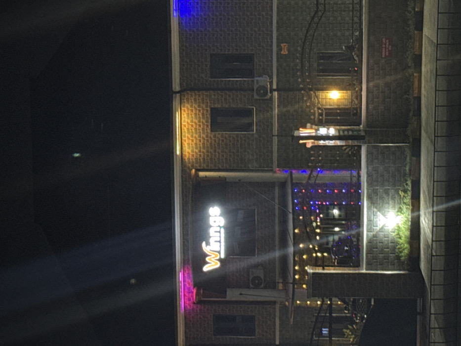 A building at night features the illuminated "Winngs" sign. Above it, a two-story facade shows lit windows and an air conditioning unit. String lights are visible in a recessed courtyard area. A lit-up pathway leads to the entrance of the building, flanked by plants. The lighting and the building's exterior create a warm, inviting atmosphere.