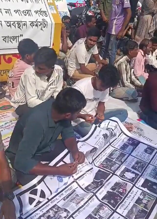 group of people sitting on a street, likely involved in a protest or demonstration. Many are sitting on mats or pieces of paper, and some are looking at printed materials or posters on the ground. Some individuals are interacting with one another. There are several cars and motorcycles parked nearby, and there are pedestrians walking past the group. A large banner with Bangla text is visible in the background, along with other posters. The environment appears to be an urban setting, with trees and buildings in the background.