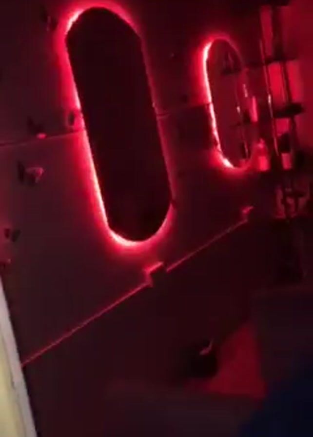 n interior space with a wall that has several oval-shaped openings illuminated with blue or green lights