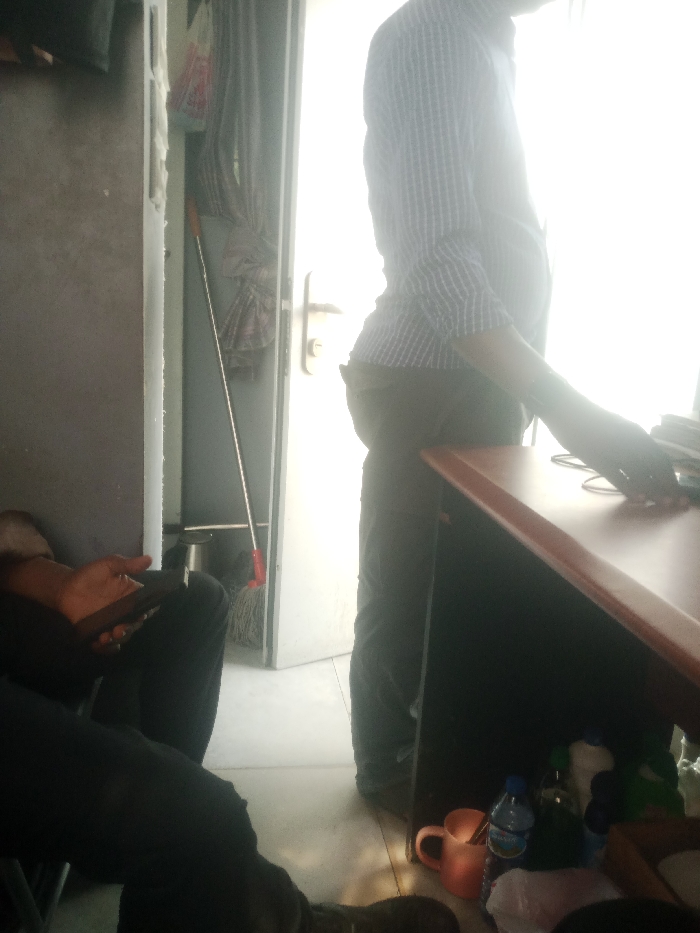 The scene depicts an interior space, likely an office or a small commercial establishment, located in Abuja, Nigeria. The image features two individuals and various objects within a confined, functional environment. On the right side of the frame, a person stands facing left, largely silhouetted against a bright, open doorway in the background. This individual wears a light-colored, vertically striped long-sleeved shirt with rolled-up sleeves and dark-colored trousers. Their right hand rests on the brown wooden surface of a desk or counter, positioned near a black electronic device and a coiled black cable. Underneath this desk, on the light-colored tiled floor, are an orange ceramic mug, a plastic water bottle with a blue cap, several other plastic bottles of varying sizes and colors, a light-colored cloth, and a brown rectangular container. In the left foreground, the lower body of a second individual is visible, seated. This person wears dark-colored trousers and holds a dark-colored smartphone with both hands, actively engaging with the device. The background is dominated by a bright, white-painted doorway that is ajar, leading to an intensely lit area beyond. A silver-colored door handle is visible on the door. In the space revealed by the open door, a mop with a red handle leans vertically against a surface. A metallic container and some draped dark fabric are also visible behind the mop. The wall on the far left is plain grey, with a white vertical trim element. The floor throughout the visible area is light-colored and tiled.