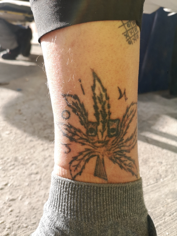 A close-up, angled view focuses on the lower right leg and ankle of an individual, illuminated by direct sunlight, in an outdoor, paved area within the city of Pardubice, Czechia. The subject's skin is light-toned and exhibits fine body hair. A black fabric cuff or garment is visible above the ankle, and a grey ribbed sock covers the foot below the ankle. The leg features several tattoos: a large, central, black-outlined design depicting a stylized cannabis leaf with two rectangular shapes resembling eyes incorporated into its center; faint vertical characters, possibly "10S," positioned to the left of the cannabis leaf; a smaller, stylized "M" or similar character to the right; and a grid-like tattoo resembling a Tic-Tac-Toe board with "X" and "O" markings, located higher on the leg to the upper right. In the out-of-focus background, a crouched individual wearing dark clothing and shoes is partially visible on a light-colored, textured ground, engaged in an indistinct activity near an unseen object, possibly a vehicle component. Further indistinct dark and light objects are also present in the background.