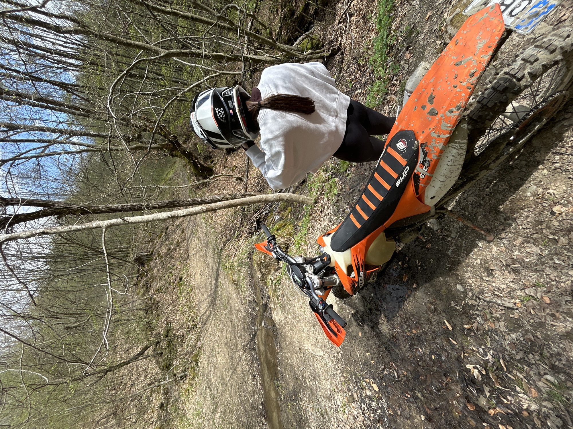 - "A person wearing a white sweatshirt, black pants, and a black and white helmet stands next to an orange dirt bike in a wooded area" by FM-TM8b82, licensed under CC BY 4.0
