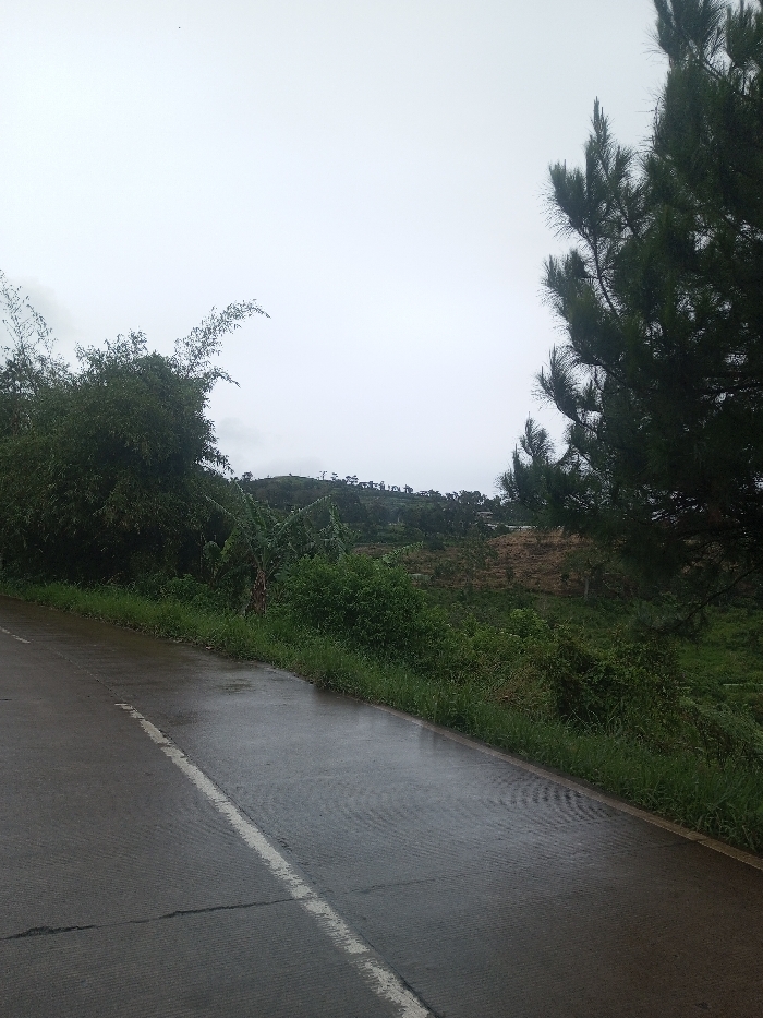 The image displays an outdoor scene in Babaliya Mal., India, on an overcast day, characterized by a wet, paved road in the foreground. The road occupies the lower left quadrant of the frame, showing a solid white line marking its right edge. The wet asphalt surface exhibits ripple-like textures and minor cracks. To the right of the road, a strip of green grass transitions into dense natural vegetation. A large cluster of bamboo is prominent on the left side of the frame's midsection, while a dense coniferous tree branch occupies the far right foreground. The midground features a descending slope covered with varied green foliage and patches of exposed, lighter-brown soil. The background is dominated by multiple layers of tree-covered hills under a uniformly light grey, cloudy sky. No individuals, animals, or active interactions are visible in the scene.