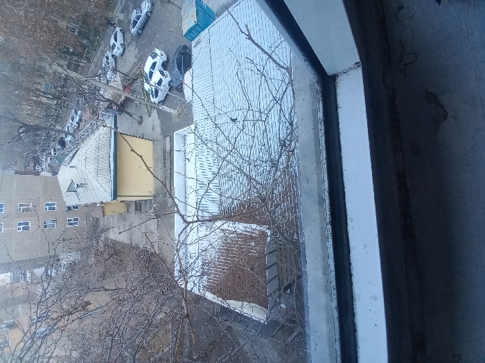 This image presents an elevated, downward-angled view of an urban residential area in Fergana City, Uzbekistan, under what appears to be an overcast sky during late autumn or winter. The bottom edge of the frame reveals a dirty, white-painted window sill and a portion of the window frame. In the mid-ground, a single-story building with light yellow exterior walls and a gray corrugated metal gable roof is prominent. A small chimney is visible on its roof. To the left and rear of this building, a multi-story apartment block, showing at least five floors, is constructed of a grey material with multiple uniformly-sized rectangular windows. An asphalt-paved area functions as a parking lot and access road, where approximately ten to twelve passenger vehicles are parked. These vehicles are primarily sedans and hatchbacks, with colors including white, silver, and dark grey or black. A blue rectangular utility bin or dumpster is partially visible on the far right edge of this paved area. Bare deciduous trees, devoid of leaves, are scattered throughout the scene. A prominent tree branch extends diagonally from the right side of the foreground, while the branches of another bare tree partially obscure a lower, flat roof located immediately beneath the yellow building. This lower roof surface is partially covered with brown organic debris, consistent with fallen leaves. No individuals are discernible, and no specific actions or interactions are depicted within the static scene.