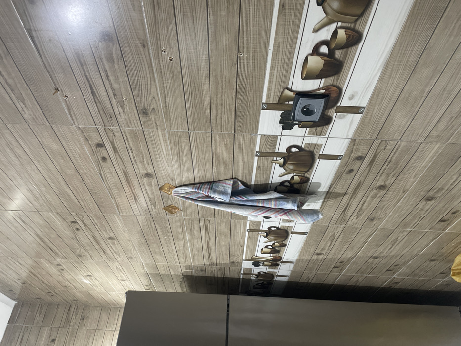 kitchen ceiling with faux wood-grain tiles. A decorative strip runs across the center, featuring cartoon images of kitchenware. A gray and white striped cloth hangs from two small, golden hooks affixed to the ceiling. A silver refrigerator is partially visible at the bottom of the frame. The lighting is bright, with reflections visible on the tile surfaces.
