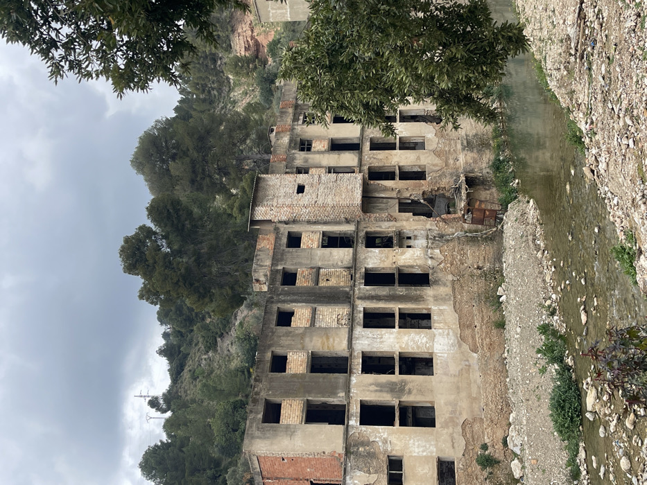 - "This image depicts the dilapidated, multi-story remains of a structure, likely an abandoned industrial building, situated along a riverbank in the city of Buñol, Spain" by FM-D8nzh1, licensed under CC BY 4.0