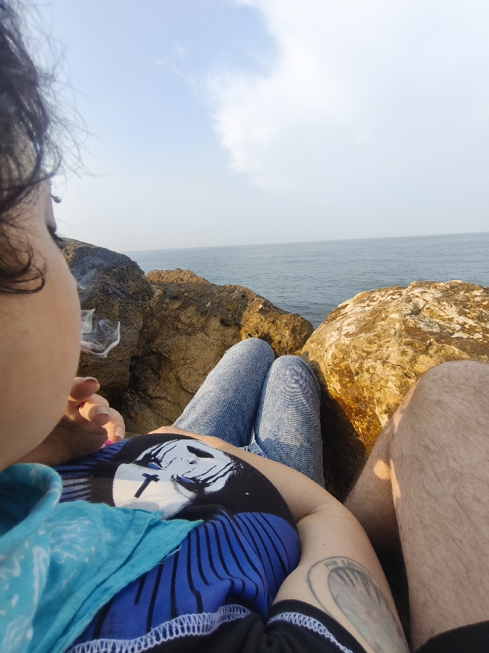 From a low angle, a person sits on rocks overlooking the ocean. They wear jeans and a patterned blue and black shirt. Part of another person's leg is visible on the right. The first person is smoking. The ocean meets a clear sky. The rocks are brown and golden.