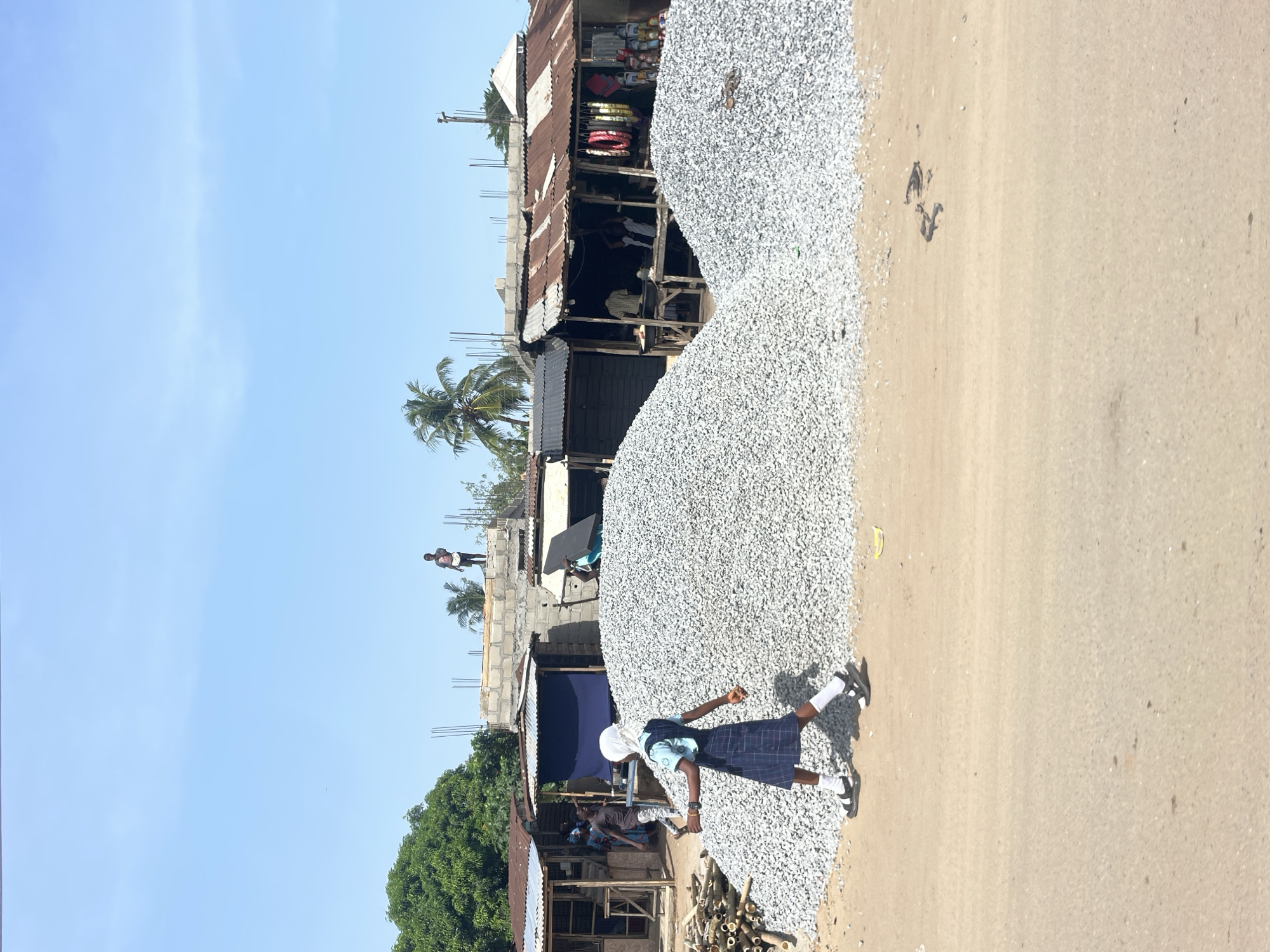 A street scene in Ikoga, Nigeria, shows a large pile of gravel alongside a dirt road. A person in a school uniform is walking beside the gravel pile. A row of shacks line the other side of the road, with people visible in and around them. A concrete building under construction is visible in the background. A palm tree is seen behind the shacks. The sky is clear and blue.