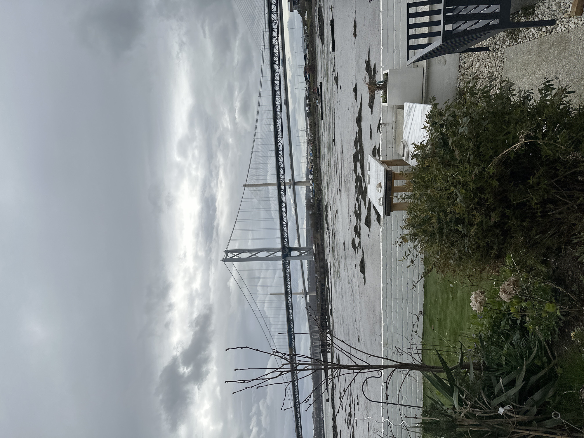 The image depicts a panoramic view of the Firth of Forth in North Queensferry, United Kingdom, under an overcast, grey sky. In the mid-ground, three bridges are visible: the prominent Forth Road Bridge (suspension bridge) with vehicle traffic on its deck, the Queensferry Crossing (cable-stayed bridge) partially visible behind it to the right, and the Forth Bridge (cantilever railway bridge) in the far background on the left. The foreground features a garden area. On the left, a bare deciduous tree with developing buds stands prominently, partially obscuring the bridges. Below it, green grass and various plants, including some with dried, light-brown flower heads, are present. On the right, a low, white-painted brick wall runs horizontally. Behind this wall, a light-colored outdoor table with a stone or marble top and wooden legs holds two small, smooth stones. A second, similar light slab is to its right. A white square planter contains a small plant. A dense green bush occupies the immediate right foreground. Further right, a dark-colored metal slatted bench rests on light gravel, which transitions to a concrete path and then to grass. The water of the Firth of Forth appears calm, revealing extensive muddy or silty foreshore with patches of dark seaweed or vegetation, indicative of low tide. Several small boats are moored on the distant opposite bank. No people are visible.