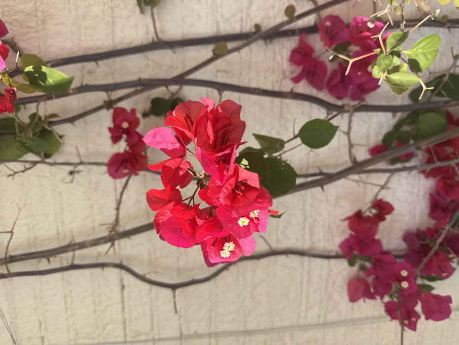 - "The image displays a bougainvillea vine climbing against a light-colored, textured exterior wall, likely stucco or painted brick, under natural daylight conditions in Los Angeles, United States of America" by FM-VkbOQ2, licensed under CC BY 4.0