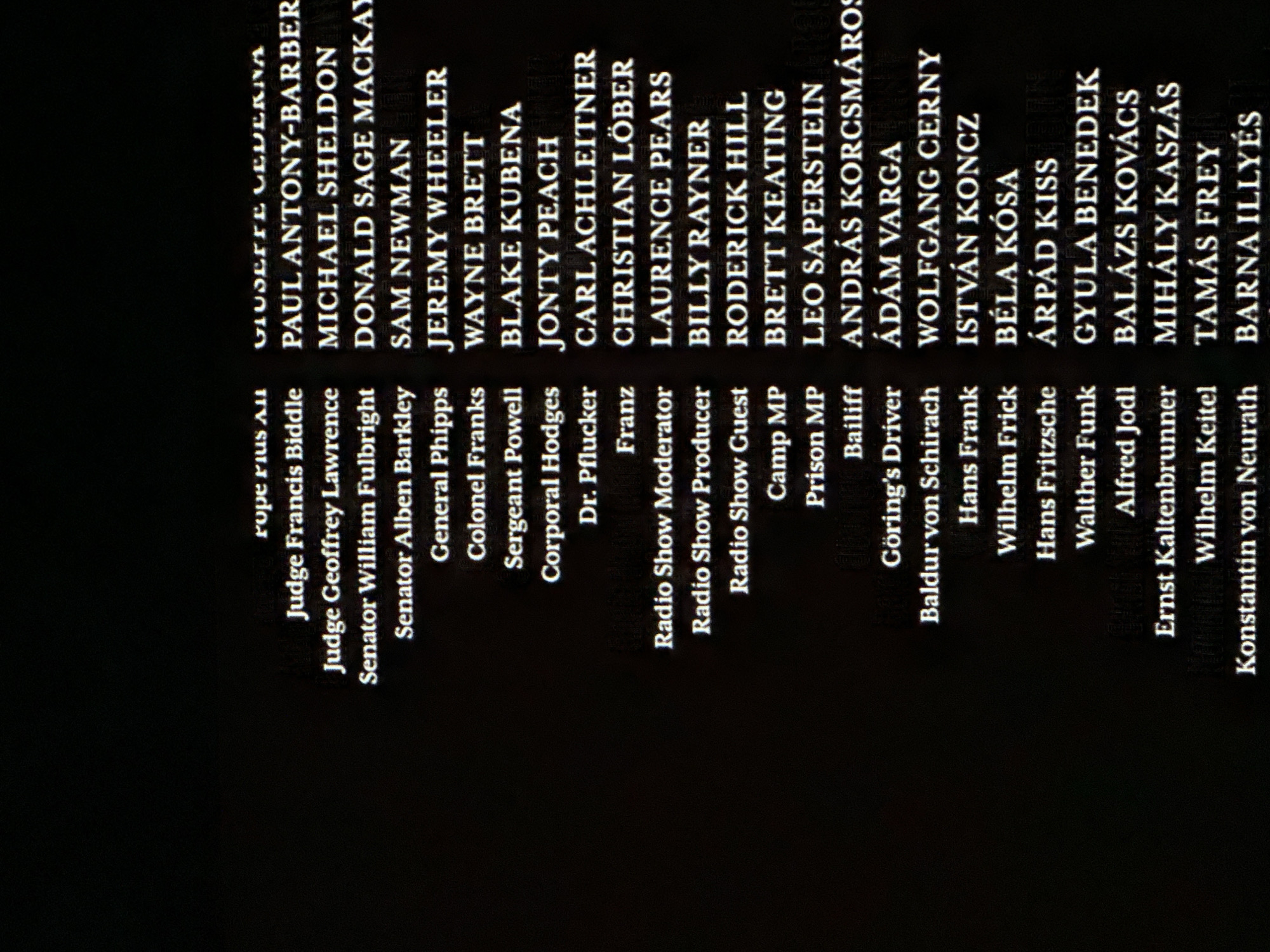 list of names and character designations in white text against a black background