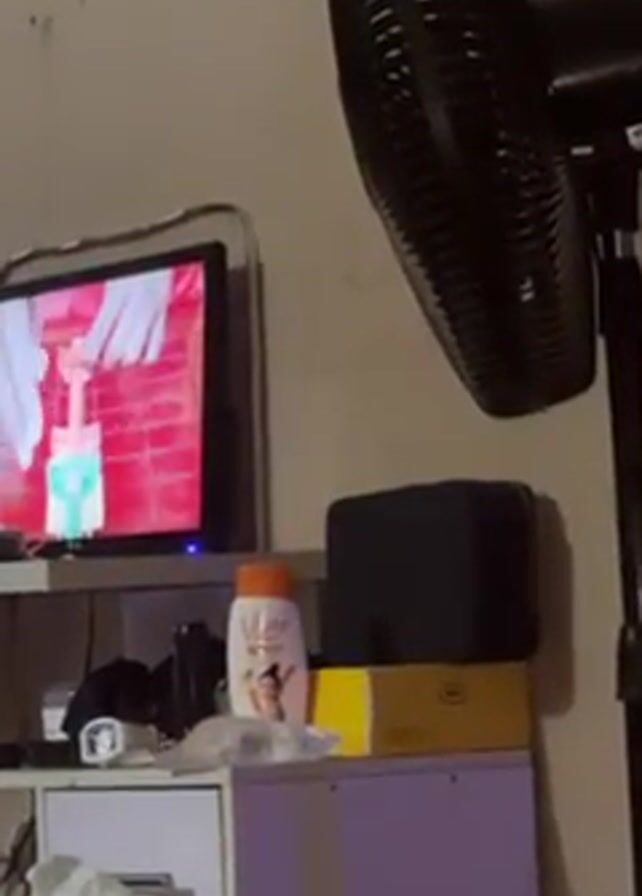 A dimly lit room featuring a television displaying a close-up image of hands manipulating a green and white object with red accents. A black standing fan is positioned next to a white and lavender-colored cabinet holding items like lotion, boxes, and a small black speaker. A white plastic bag sits on the lower shelf of the cabinet, and a foot is visible in the bottom left of the frame.