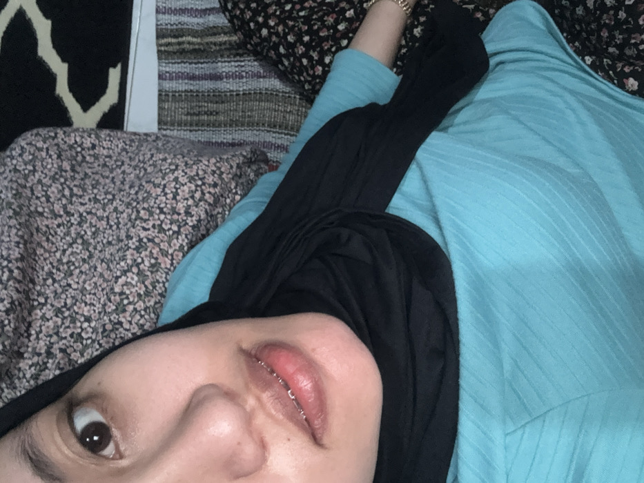An indoor, close-up self-portrait depicts a female individual, partially visible from the upper torso upwards, looking directly at the camera from an elevated, slightly tilted perspective. The subject has light-to-medium skin, with her left eye, nostril, and mouth clearly visible. She wears dental braces on her upper teeth, which are partially exposed as her lips are slightly parted. Her head is covered by a black hijab. She is dressed in a light turquoise or teal long-sleeved top with a subtle diagonal ribbed texture. A gold-toned bracelet or series of bangles is visible on her right wrist. The background consists of multiple patterned fabrics, including a floral print on the upper left and a striped and geometric pattern on the upper right, consistent with a residential interior. Location: Kebonsari, Indonesia.