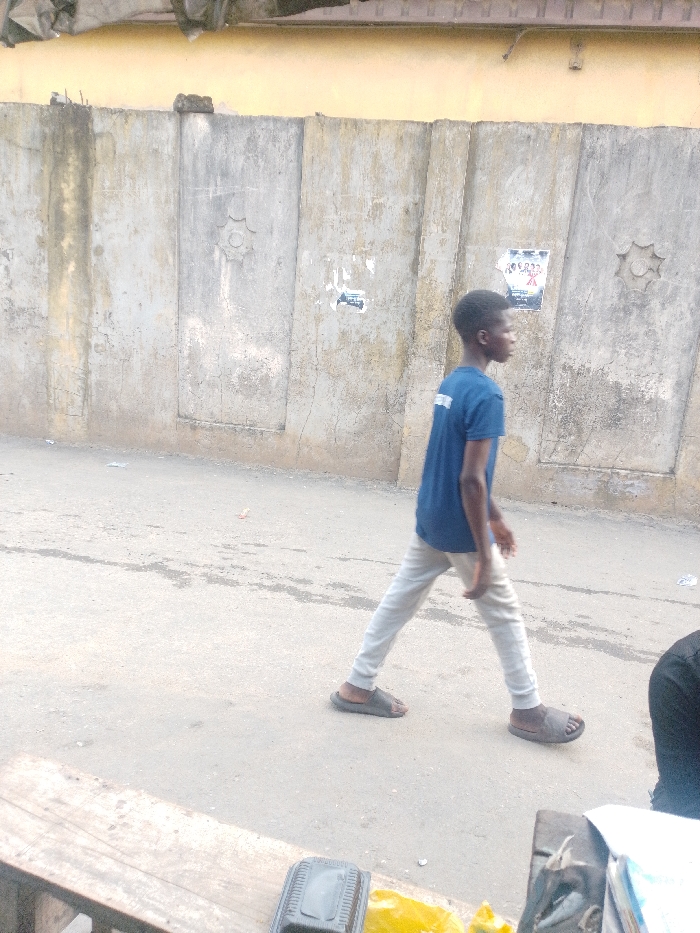 A young man is walking on a street. He is wearing a blue T-shirt, light gray pants, and dark-colored sandals. The street appears to be in a somewhat urban area with a weathered, pale yellow building in the background. The wall of the building has decorative patterns and posters on it. There are objects and possibly a table in the foreground. The day appears to be overcast or slightly hazy.