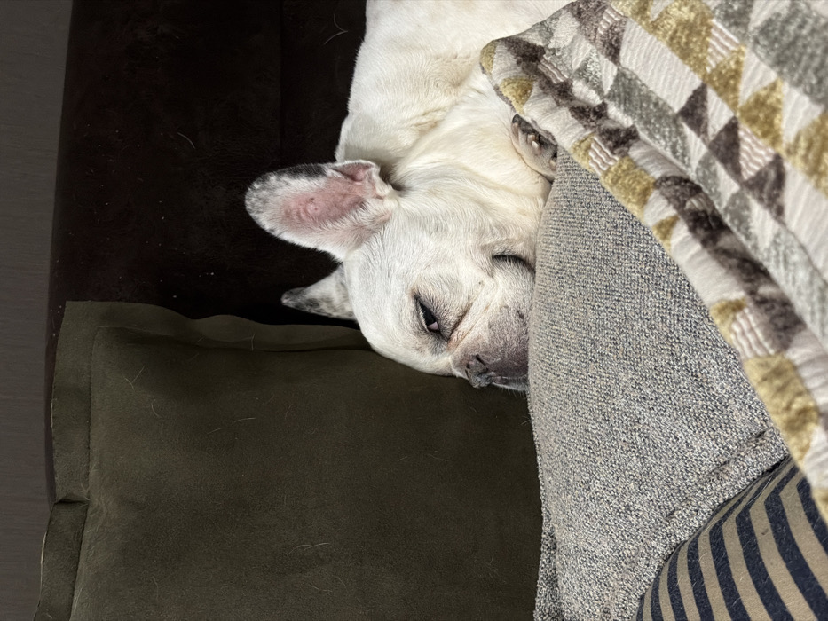 - "A white French Bulldog is observed resting on a light grey textured cushion in an indoor domestic environment located in Blagoevgrad, Bulgaria" by FM-DK2ln2, licensed under CC BY 4.0