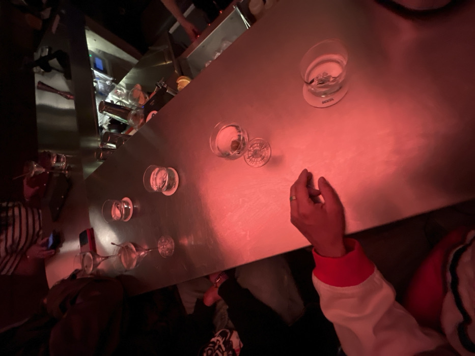 The scene depicts an interior view of a bar or lounge within Mexico City, Mexico, characterized by pervasive red ambient lighting. A brushed metal bar counter dominates the foreground and mid-ground. In the lower-left, a person's right hand, adorned with a gold ring on the ring finger, rests on the counter. This individual is wearing a white garment with a prominent red cuff. Adjacent to this hand, a stem glass containing clear liquid and an olive is positioned. Further right, a short cylindrical glass with clear liquid and ice is placed on a white coaster. Moving towards the center, two champagne flutes, one mostly full and one partially full, are visible. Two additional short cylindrical glasses, each containing clear liquid and resting on white coasters, are also present. Two smartphones are visible on the counter in the mid-ground; one with a red casing is partially obscured, and another is held by a person in a striped top in the upper-left. The background shows the operational section of the bar, featuring various bottles, shakers, and other bar equipment, illuminated by a cooler light source compared to the foreground. No active interactions between individuals are depicted, but the arrangement of drinks and personal items suggests a social gathering.