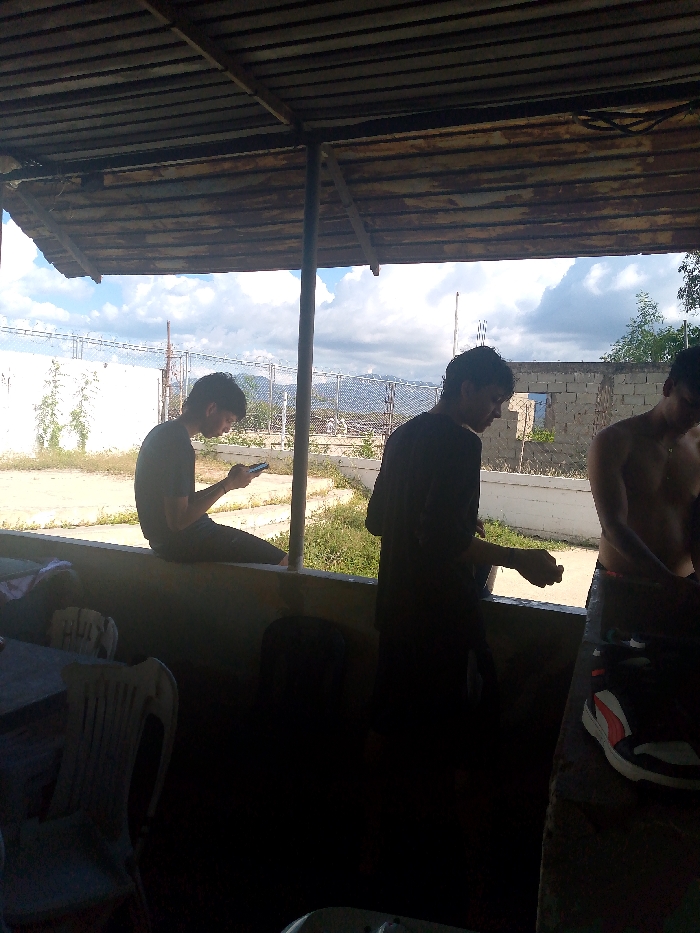 Under a corrugated metal awning, three young men are present. One sits on a ledge, absorbed in a phone. Another stands nearby, partially obscured in shadow. A third man, shirtless, is positioned to the right, closer to the foreground. A table with plastic chairs and a pair of sneakers complete the foreground. Beyond, a wire fence, a low concrete structure, and a mountain range fade into a cloudy sky.