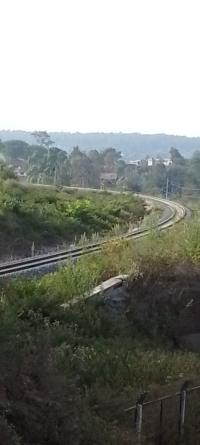 A curved railway track cuts through a landscape of lush greenery