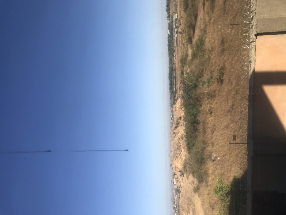 A landscape view with clear blue sky occupying half the frame. Thin contrails are visible. The other half shows dry, yellow terrain with sparse green vegetation. A distant line of structures is seen near the horizon. A portion of a building's facade with barbed wire is on the right. Shadow covers the building.