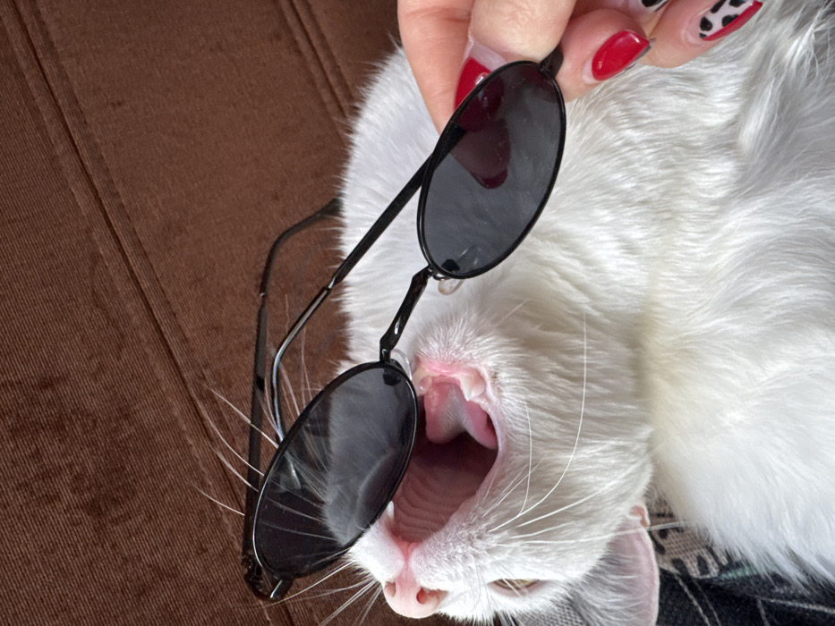 A close-up, indoor image depicts a white cat with its mouth wide open, mid-yawn or meow. Its pink tongue is visible, along with its teeth and prominent white whiskers. A human hand, identified by red nail polish on several nails and a black-and-white cow print design on one nail, holds a pair of black sunglasses with small, oval lenses and thin frames above the cat's face. The sunglasses are positioned horizontally, partially obscuring the upper part of the cat's head. The background consists of a textured, brown fabric, likely upholstery. The specific location in Sofia, Bulgaria cannot be determined from the visual information provided within the image.