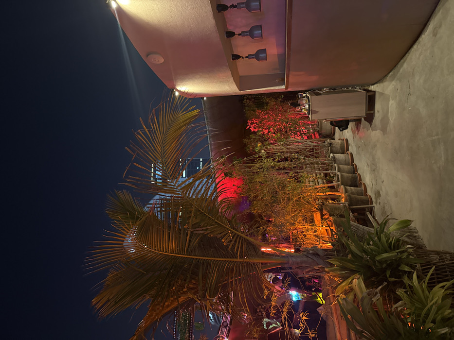 A nighttime scene features a palm tree with illuminated fronds against a dark blue sky. Behind the tree, a building is partially visible. To the right, a wall curves inward, illuminated with warm light. Below the curved wall are rows of potted plants. Lights hang from the top, contributing to the overall ambiance. The scene is rich with textures and varying light sources.