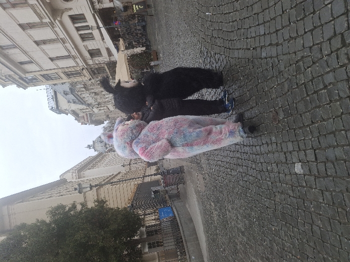 Three individuals stand on a wet cobblestone street in a historical urban setting. The location is identified as a pedestrian area adjacent to the CEC Palace in Bucharest, Romania, with the palace visible on the left side of the frame. The leftmost individual is wearing a full-body plush costume, patterned in pink, light blue, and white, resembling a large rabbit or similar character, with prominent ears. Black footwear is visible. This individual is turned slightly with their back to the camera, facing right. The central individual is an adult male with a beard, wearing a dark padded jacket, dark trousers, and blue sneakers. His arms are crossed, and he is looking towards the right. The rightmost individual is wearing a full-body plush black costume, also resembling a large rabbit or similar character, with prominent ears and a lighter-colored facial feature. This individual is positioned in profile, facing right. All three subjects appear to be observing something off-frame to their right. The cobblestone street is damp, suggesting recent precipitation. In the background, the ornate, light-colored facade of the multi-story CEC Palace is visible on the left, along with a mature tree and a street lamp. On the right, a row of other historical, multi-story buildings with various architectural details and awnings extending over a paved area are present. The sky is overcast and gray.