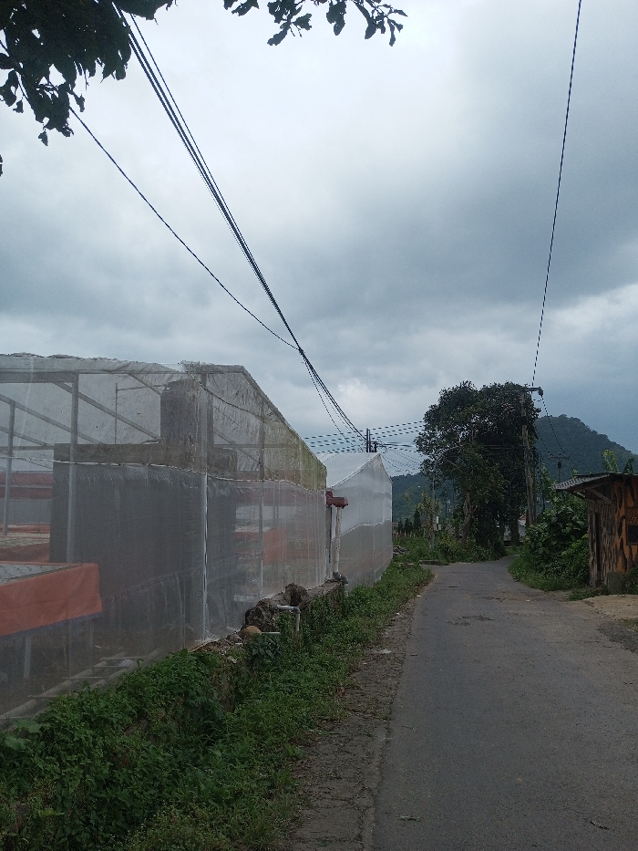 A narrow asphalt road winds between structures covered in white netting, possibly greenhouses. Lush green vegetation flanks the road's edge and a small, wood-paneled building stands to the right. Overhead, power lines cut across a cloudy sky, partially obscured by leafy branches. A distant mountain adds depth to the scene. The day appears overcast and the overall atmosphere suggests a rural or agricultural setting.