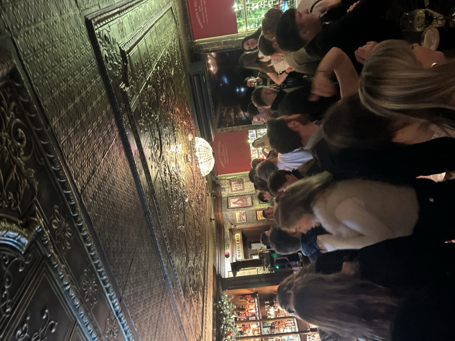 A crowded bar scene unfolds with patrons closely gathered. Ornate, textured ceiling tiles catch the light from a chandelier. Numerous people, mostly seen from the shoulders up, are focused downwards, perhaps at their phones or drinks. Shelves of bottles are visible at the end of the bar. Wall decor includes framed pictures. The overall ambiance appears dimly lit and social.