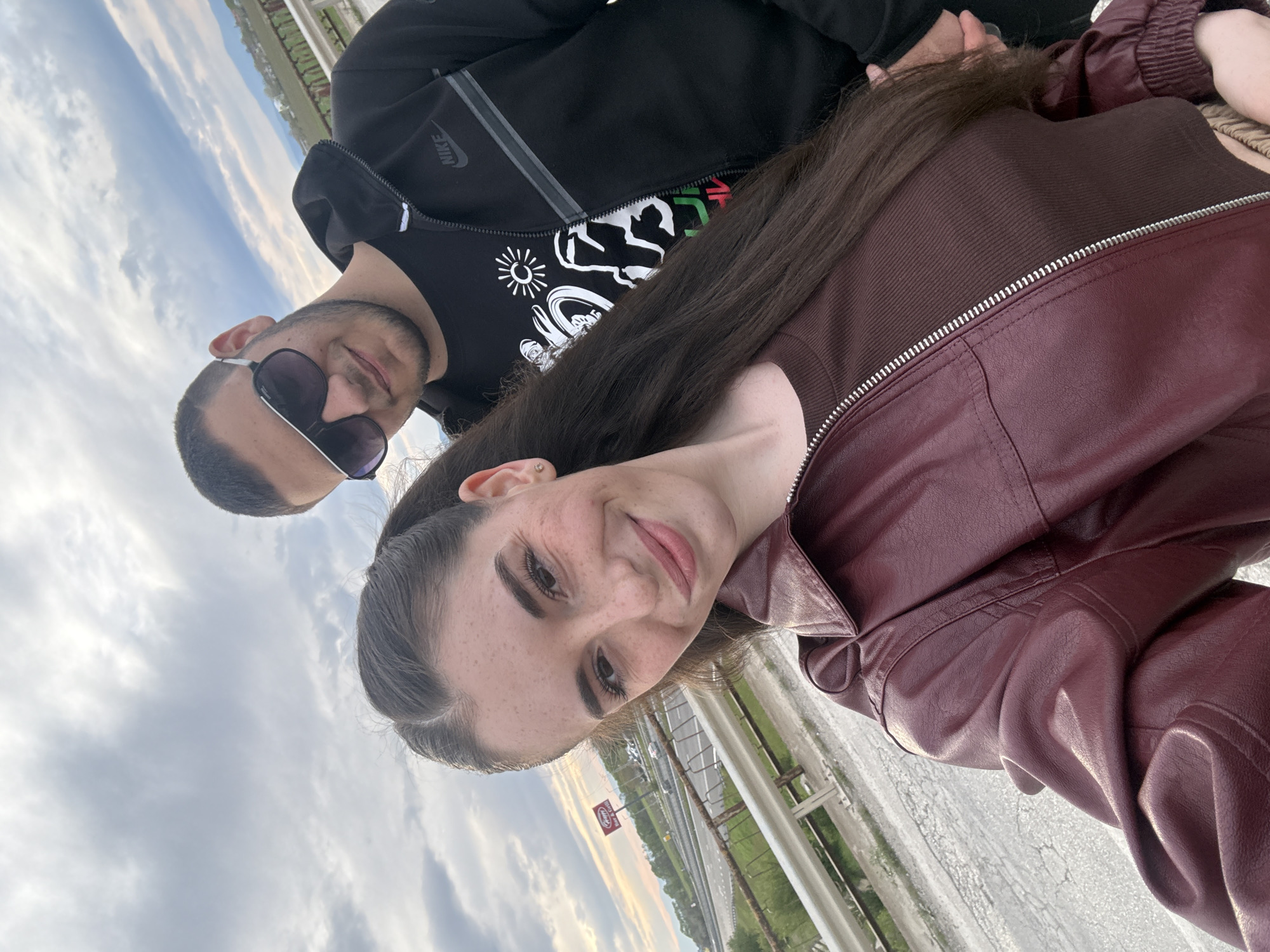 A selfie photo shows two individuals, a woman and a man. The woman has fair skin, brown hair, and is wearing a burgundy leather jacket. The man, positioned behind her, has short dark hair, dark sunglasses, and is wearing a black Nike zip-up jacket over a t-shirt with a graphic design. The background includes a highway with visible traffic, green vegetation, and a cloudy sky. A sign for "Ford Motor Company" is visible in the background. The location is likely on a bridge or overpass near Radinovo, Bulgaria, based on the sign visibility.