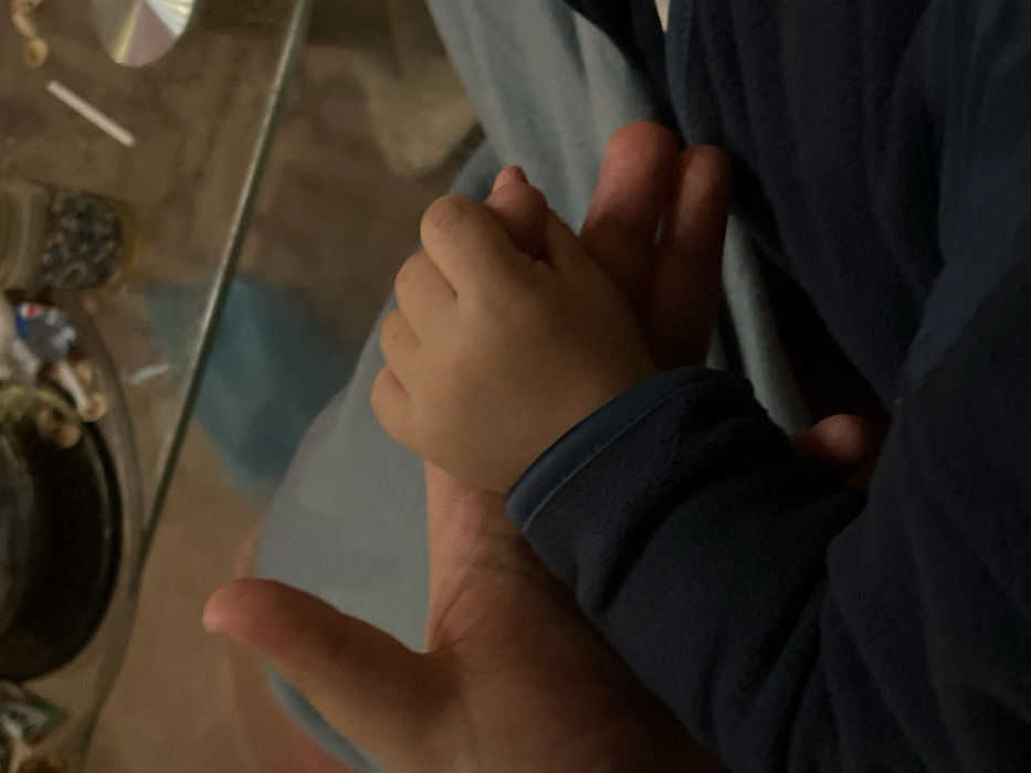 A child's hand, clad in a blue fleece sleeve, gently clasps an adult's hand