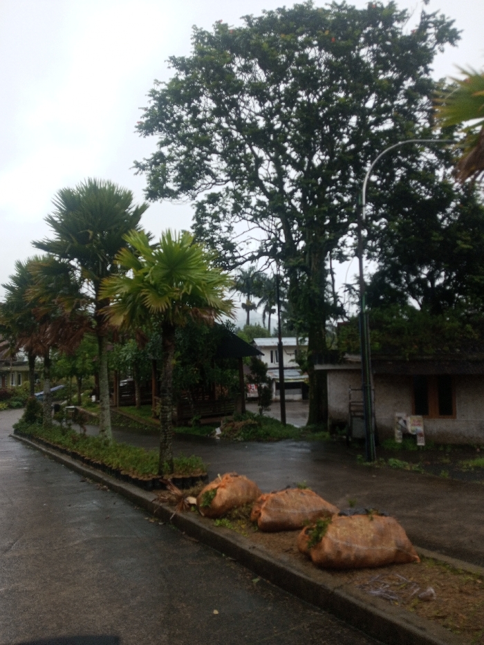 A wet, overcast scene features a street lined with palm trees and lush vegetation. A large, mature tree dominates the background. Burlap sacks filled with greenery sit along the curb. Structures, including a small building with a window and a covered area, are visible in the mid-ground. The road surface is dark and reflects the ambient light, indicating recent rain. A lamppost stands near the building.