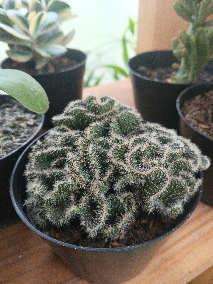 The scene depicts multiple potted plants, located in Munyati, Zimbabwe. In the foreground, a crested cactus with intricate, brain-like green growth covered in dense, short, light-colored spines is contained within a round, black plastic pot filled with dark brown soil. Surrounding this central cactus, other potted plants are visible in the blurred background and midground. To the immediate left, a portion of a smooth green leaf extends from another black pot. Towards the upper left, a variegated succulent with light and dark green leaves is present in a black pot. To the right, at least two additional green plants are partially visible in black pots. All plants rest on a light brown wooden surface, possibly a shelf or table. The background beyond the plants is softly lit, appearing as a light, out-of-focus expanse with hints of green foliage in the distance. No human subjects, animals, or specific actions are depicted.