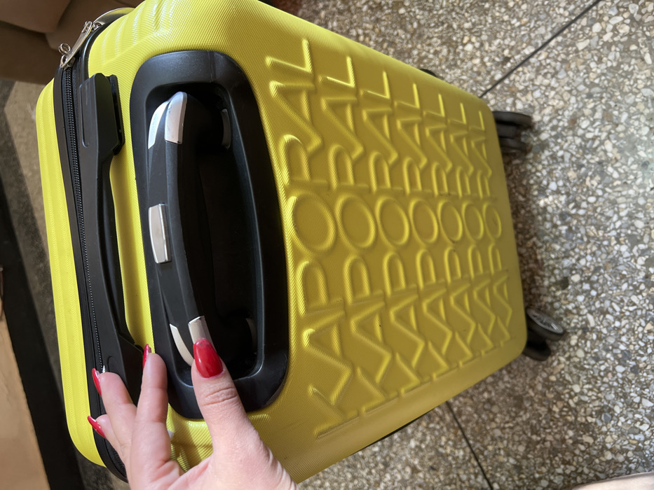 - "A bright yellow Kaporal-brand hard-shell rolling suitcase is depicted at a high angle, resting on a light-colored, speckled floor" by FM-RPGCC2, licensed under CC BY 4.0