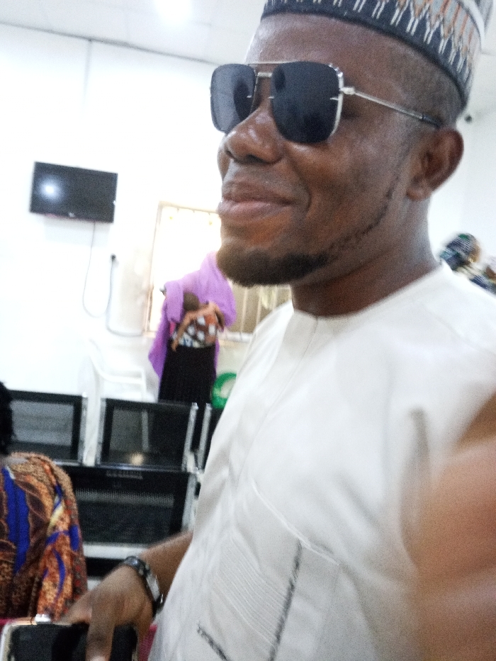 An individual, appearing to be an adult male, is prominently featured in the right foreground of the image, captured in a close-up. He wears dark, rectangular sunglasses with silver frames and a patterned skullcap with geometric designs in dark, light gray, and orange/brown hues. His face, angled slightly to his left, exhibits a subtle smile or smirk, and he has a trimmed beard along his jawline. He is dressed in a light-colored (likely white or off-white) traditional garment featuring subtle embroidered patterns on the left chest area. A dark-colored watch is visible on his left wrist, and his left hand is holding a dark-colored smartphone. The background, set in an indoor location within Lokoja, Nigeria, reveals a white wall with a wall-mounted black flat-screen television on the left. Below the television, a white electrical outlet with a plugged-in white cord is visible. Further left and lower, a person partially appears, wearing a multi-colored patterned garment. In the mid-ground behind the primary subject, several black appliances resembling microwave ovens with silver accents are arranged, potentially on shelves or desks, alongside white plastic chairs. Towards the right side of the background, another person, mostly obscured, is visible wearing a purple head covering and a dark garment, appearing to hold a small child or object. A window with vertical bars is visible behind this individual, admitting external light. The room is uniformly lit by overhead artificial lighting.