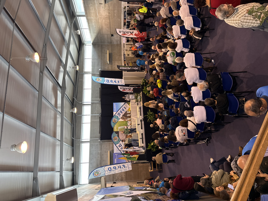 This image captures an indoor awards ceremony or presentation in a large hall located in Mora, Portugal