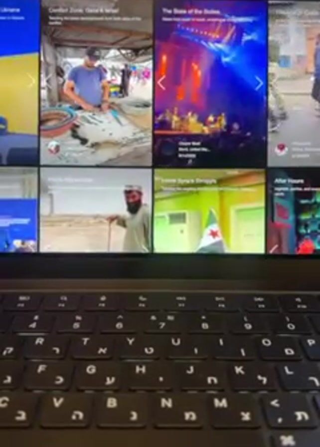 screen displaying a social media feed with various video thumbnails, laid out in a grid format, above a laptop keyboard. The video thumbnails show images of different scenes: aid for Ukraine, conflict zone images of Gaza and Israel, a band performing on stage, an individual walking on a street, a man in Afghanistan, an image captioned "Inside Syria's Struggle" with a flag, and another thumbnail labeled "After Hours" featuring speakers. The laptop keyboard is visible in the foreground, showing both English and Hebrew characters on the keys. The camera is static and focused on the laptop screen and keyboard.