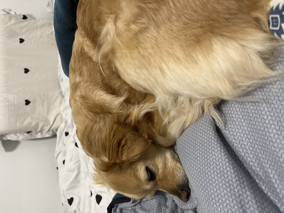 - "A light-furred dog, consistent with a Golden Retriever breed, is observed sleeping curled on a bed" by FM-m1kZq2, licensed under CC BY 4.0