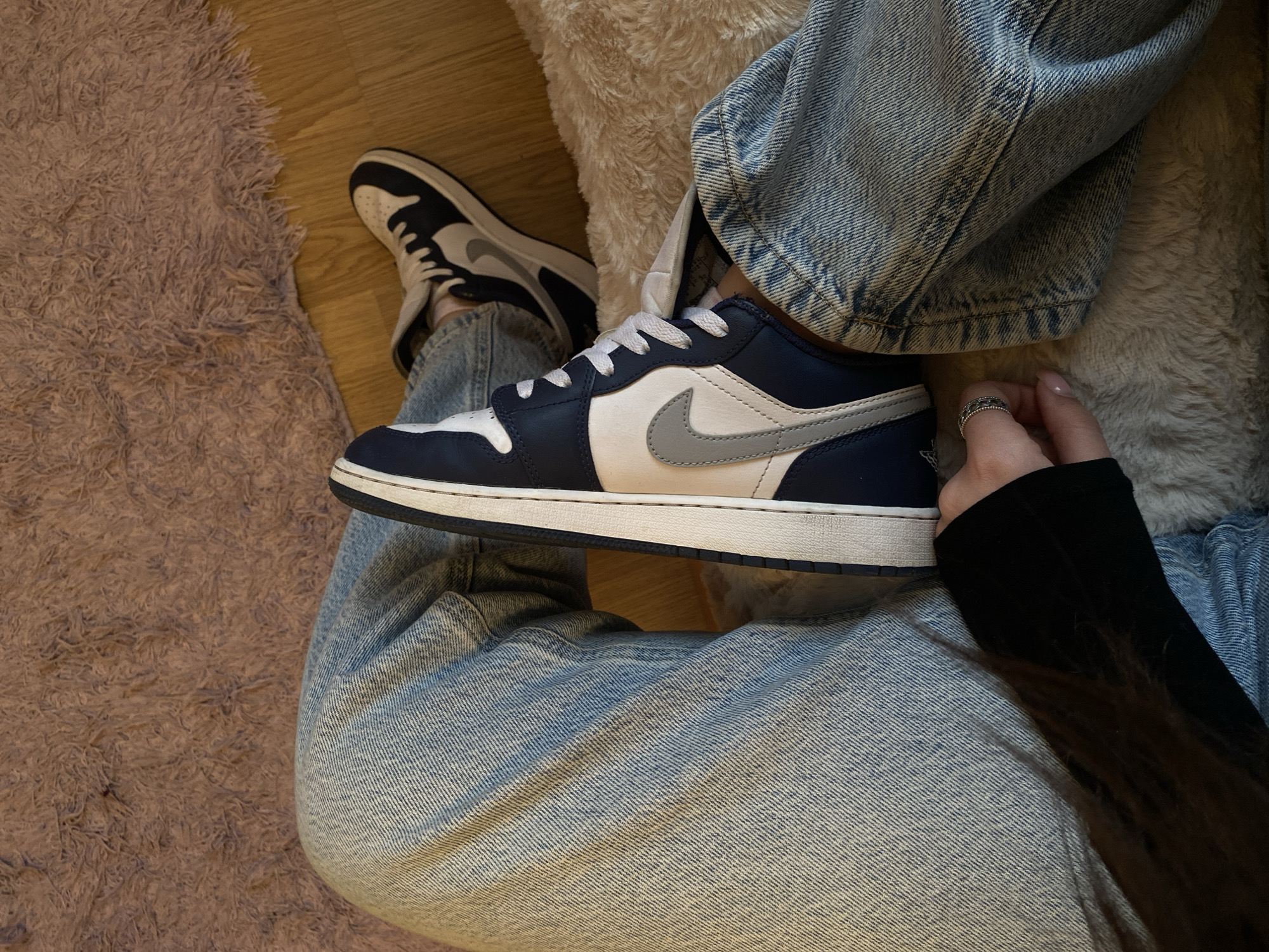 The image depicts the lower body of an individual in an indoor setting in Björklinge, Sweden. The perspective is a high-angle overhead shot. The person is wearing light blue, faded denim jeans and two Nike Air Jordan 1 Low-style sneakers. The sneakers are dark blue and white, featuring a light gray "Swoosh" logo and white laces. The individual's left arm is partially visible on the lower left, wearing a black long-sleeved garment. A left hand is visible, adorned with a silver ring on the ring finger, and the nails appear manicured with light-colored polish. The environment consists of a textured, light brown shaggy rug covering the upper portion and extending under the right leg, juxtaposed with light-colored wooden floorboards visible on the right side and under the left leg.