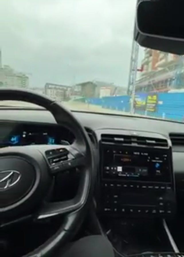 A car's interior is the focus of the video, presenting a driver's perspective. The steering wheel, featuring the Hyundai logo, is prominently displayed. The car's dashboard is modern, housing a digital instrument panel and a central infotainment screen. The driver, visible from the shoulders down, is wearing a black shirt. The car is in motion on a city street, with buildings and construction sites visible through the windshield. The weather appears overcast. Music is playing in the car.