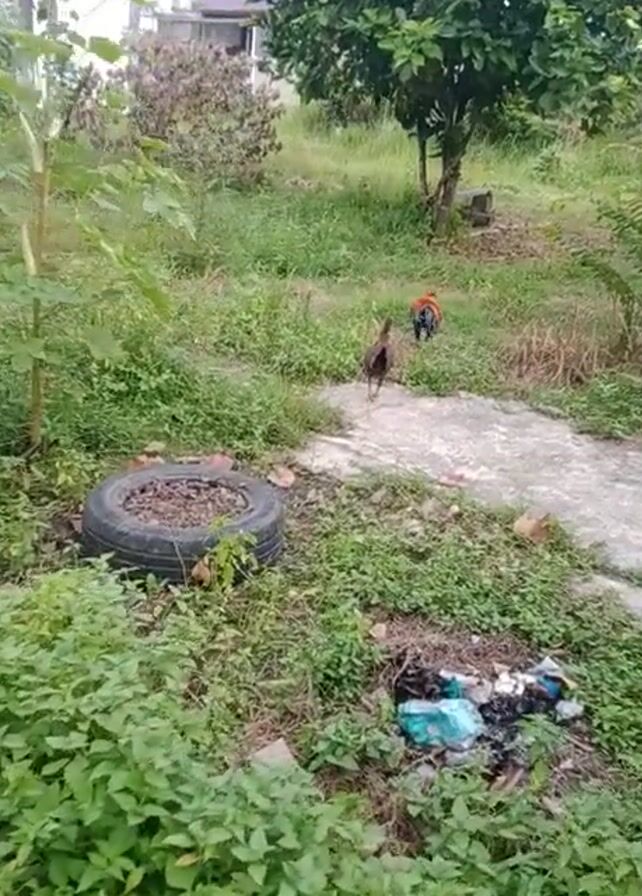 grassy field with a rooster and a hen. The rooster is red and black, and the hen is brown. They are walking around the field. There is a concrete slab and a tire in the field. In the background, there are trees and a building. There is trash visible in one corner of the frame. The video is taken from a slightly elevated perspective.