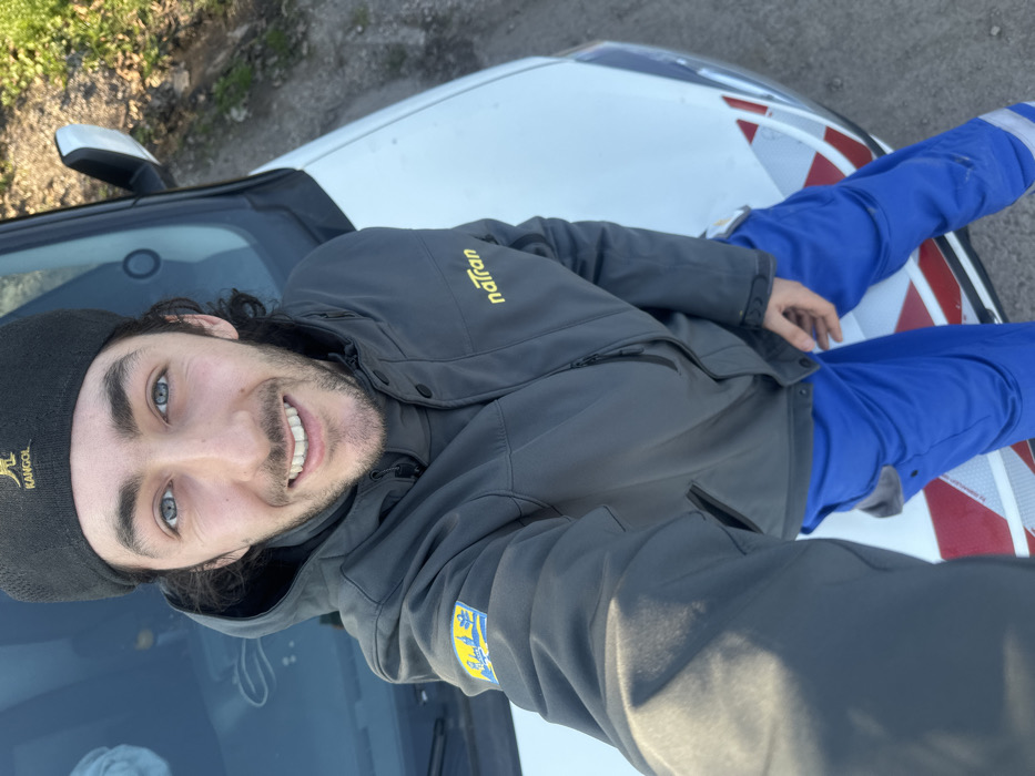 An individual is depicted outdoors, seated or leaning on the hood of a white vehicle, posing for a selfie in the city of Carvin, France. The subject is a young adult male with fair skin, dark curly hair, and blue eyes, smiling directly at the camera. He wears a black Kangol beanie, a dark grey softshell jacket with a yellow "natran" logo on the right chest and a yellow and blue rectangular patch on the left sleeve, and blue work trousers with reflective stripes and grey accents. The vehicle's hood displays red and white diagonal reflective markings. A dirt path and sparse vegetation are visible in the background, under bright daylight.