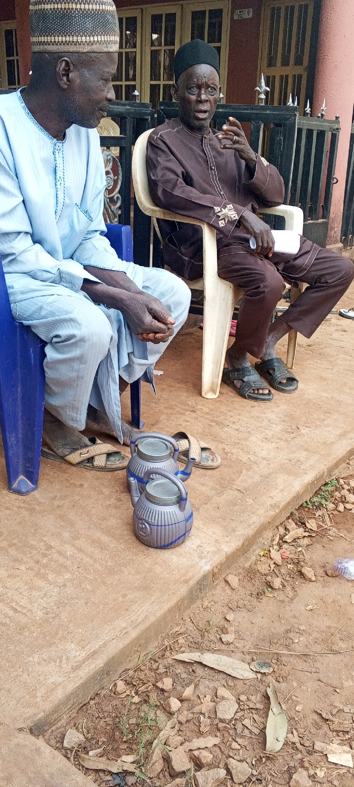 Two adult males are seated on plastic chairs outdoors in Doma, Nigeria