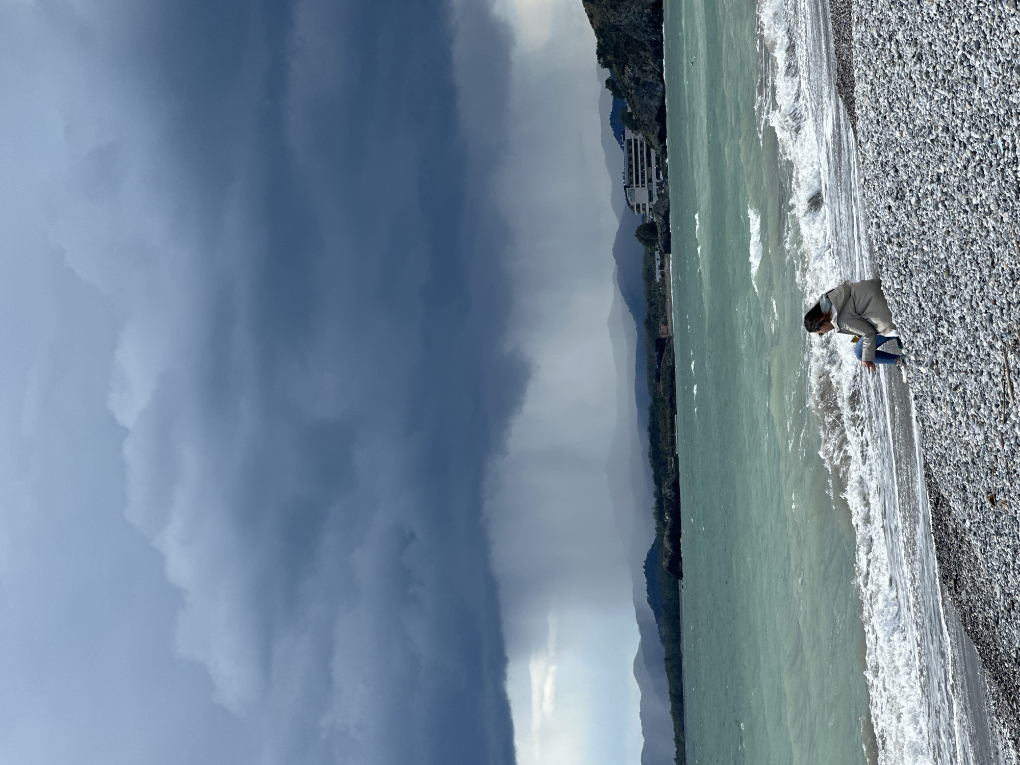 beach scene in Fethiye, Turkey. A person is crouched near the shoreline, on a pebble beach. The sea is choppy with white waves. In the background are mountains and buildings. The sky is divided; one side is dark and cloudy, likely indicating an approaching storm, while the other side is brighter.
