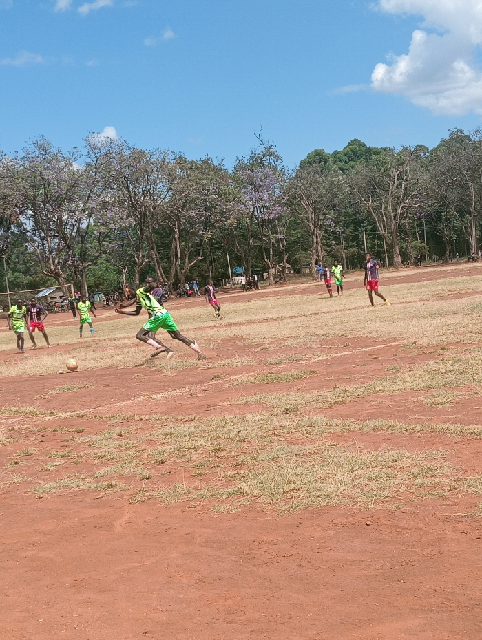 An outdoor scene in Lugari ward, Kenya, depicts a football match or practice on a reddish-brown dirt field with scattered patches of dry grass