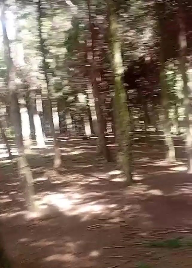 forest with tall, thin trees, primarily evergreen or coniferous, densely packed together. The forest floor is covered in brown needles and dirt, with patches of green ground cover visible in places. Sunlight filters through the trees. A person says, "Would like to join me in going inside the forest." The camera moves, suggesting that the speaker is walking into the forest.