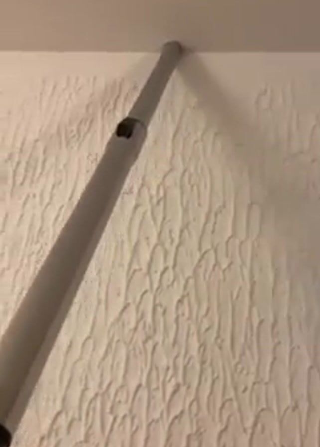 A vacuum cleaner extension wand is pressed against the top corner of a wall that has a textured surface. The wand is gray and black, with a small hole or notch visible on the side. The vacuum is actively running, evidenced by the sound, as the wand makes contact with the wall's edge.