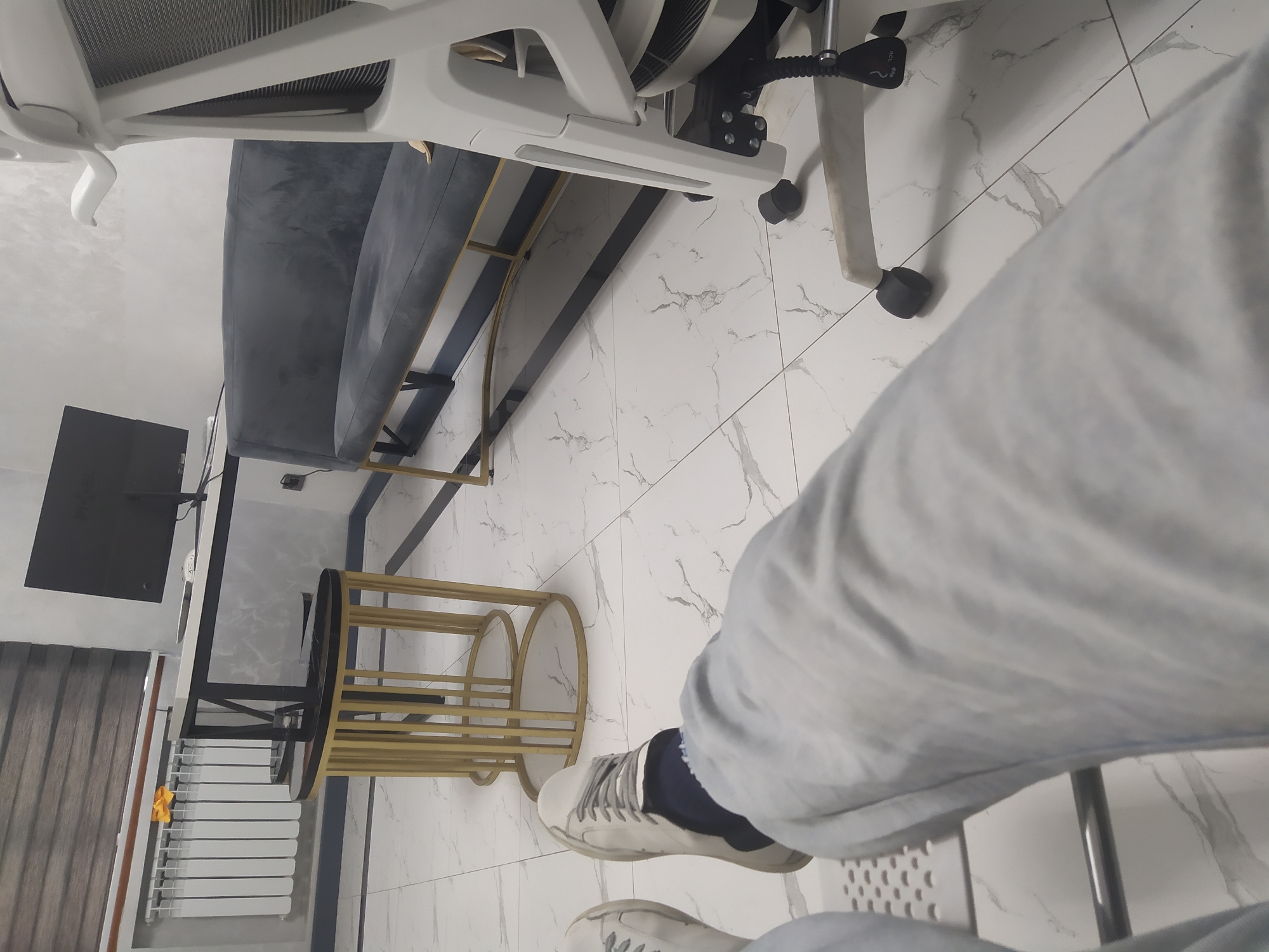 The image depicts an indoor scene from a first-person perspective, showing the lower extremities of an individual seated in an interior space, possibly an office or waiting area, in Tashkent, Uzbekistan. The individual wears light blue jeans, dark blue socks, and white lace-up sneakers, with their legs extended forward. The feet are resting on an unseen support structure. The floor is composed of white tiles with gray veining resembling marble, featuring dark grout lines and intermittent dark horizontal banding. To the right, the white frame and black wheeled base of an ergonomic office chair are visible, including a control lever marked "RCL". In the mid-ground on the left, two round side tables are present, featuring gold-colored vertical slat bases and dark, oval-shaped tops. To the right of these tables, a dark gray upholstered bench or sofa with a low back and gold-toned metal frame is positioned against the wall. A light-colored object rests on its seat. The background reveals a white radiator beneath a window covered by dark brown horizontal blinds. A crumpled yellow object is visible on the radiator. A desk or table with a black monitor is located further back. The walls are finished in a light gray with a subtle texture.