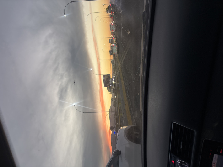 The image captures an elevated multi-lane highway in León, Guanajuato, Mexico, identifiable as the Puente de la Maxipista León-Aguascalientes (Eje Metropolitano/Libramiento de León), observed from the interior of a vehicle at dusk or dawn. The sky presents a dramatic sunset with a vibrant orange and yellow glow along the horizon, transitioning upwards into a heavily overcast, grey cloud layer. Numerous streetlights, activated and producing distinct lens flares, illuminate the roadway. Traffic is visible in multiple lanes, appearing to be either stationary or moving slowly. A white sedan is partially visible in the adjacent left lane, its front section and a faint blue light on its roof (potentially a police vehicle) discernible. A continuous line of diverse vehicles, including cars and a large commercial truck, extends into the distance, with red brake lights illuminated on multiple cars and white headlights visible. A silhouette of a mountain range is present on the distant horizon, beneath the brightest part of the sky. A large billboard structure stands on the right side of the highway, further down the road. The dark-colored dashboard of the capturing vehicle, featuring air vents and parts of the infotainment system with a visible red hazard button, occupies the lower portion of the frame. The windshield exhibits minor streaks or dirt. No individuals are clearly visible.